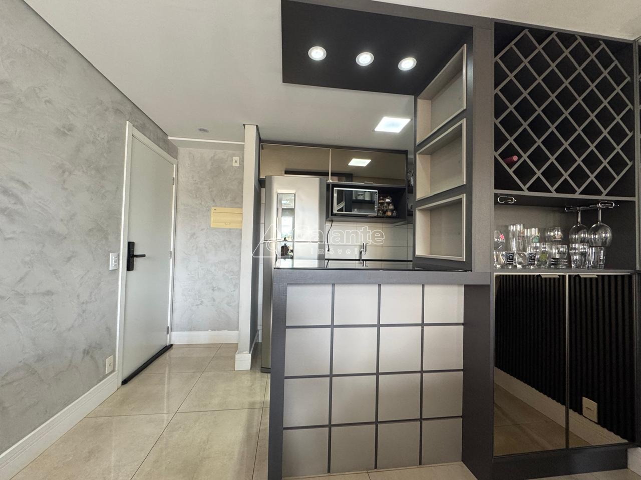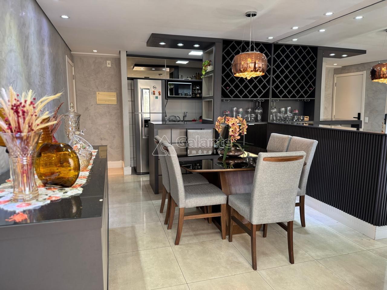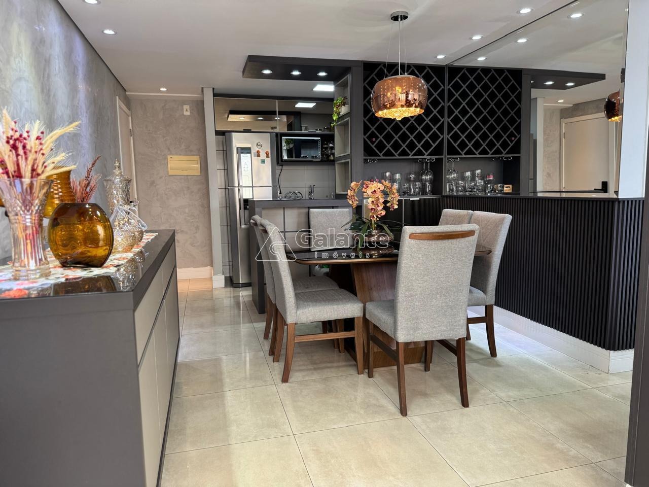 Com essa configuração, possui uma ampla sala de jantar com acabamentos em madeira ripada, espelho, barzinho com cristaleira e adega, a qual integrada a varanda Grill que possui armário, pia, fechamento em vidro e persiana, formam um ambiente lindo e aconchegante; Conta ainda com uma linda divisão para a sala de TV, com nichos e acabamentos ripados. Cozinha estilo americana integrada a sala de jantar e totalmente planejada, com cooktop, coifa e forno embutido, a qual dá acesso a área garden do apto, que se encontra coberta e também com piso porcelanato. A suíte é confortável e muito bem planejada, com ótimos armários, cabeceira embutida, mesinha, espelho, arandela e ar-condicionado quente e frio; o outro dormitório também possui ótimos armários, cabeceira e mesa embutida. Condomínio possui área de lazer completa, portaria 24 hs e um mini mercado.