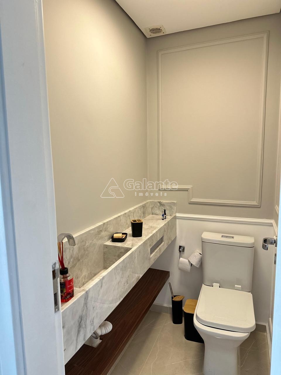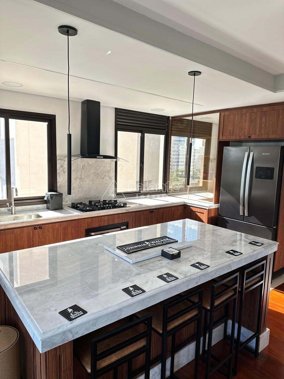 Tanto a lareira, ilha e todas as áreas frias são revestidas em mármores de alta qualidade.