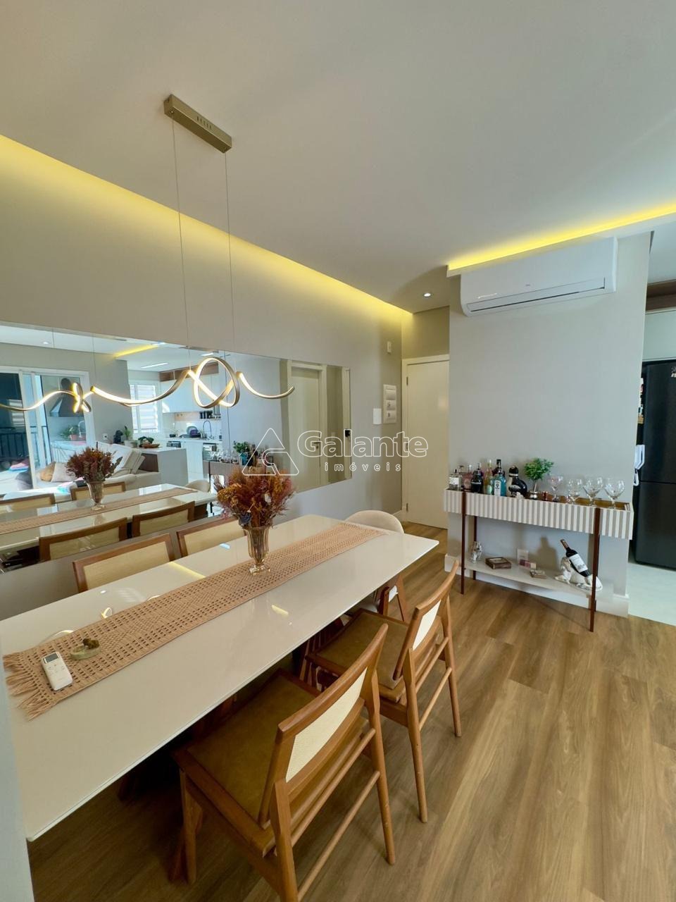 Sala de jantar espelhada, mais sala de estar e tv com painel para tv de 65.