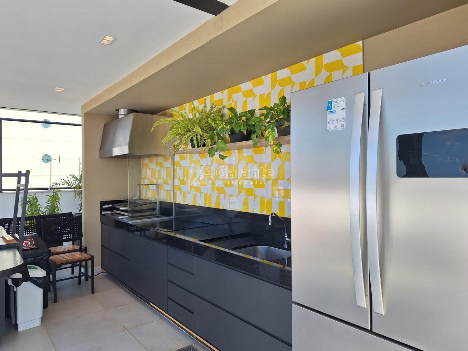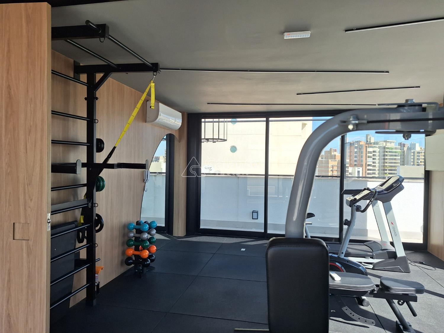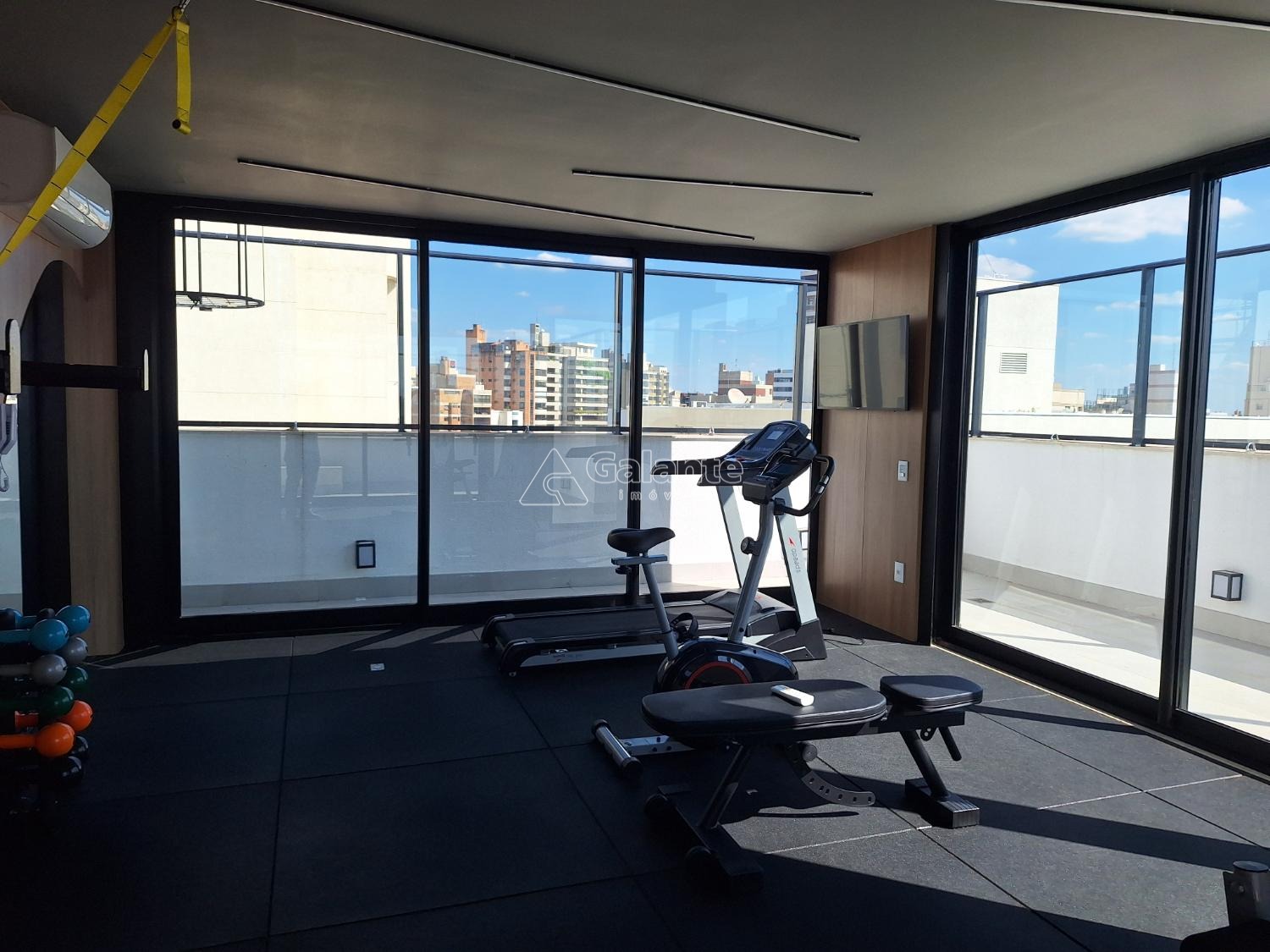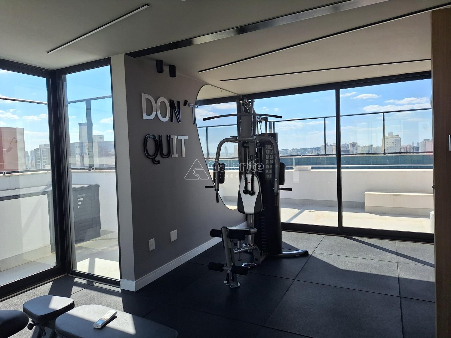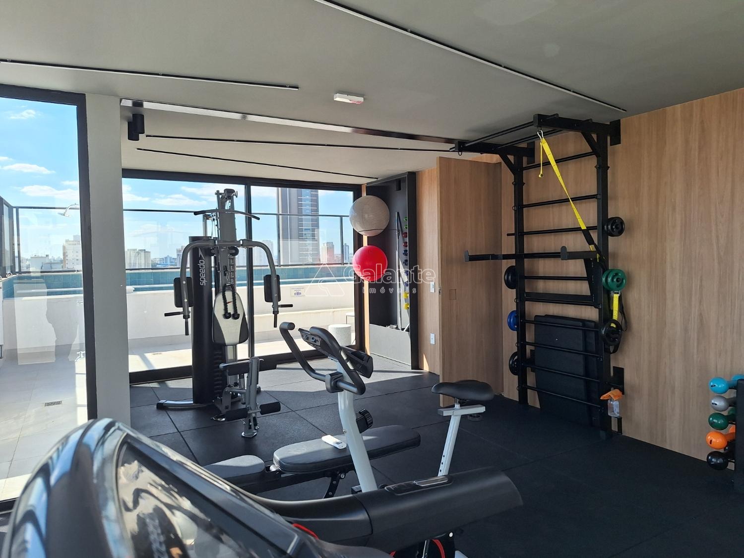 Área de lazer com academia e churrasqueira.