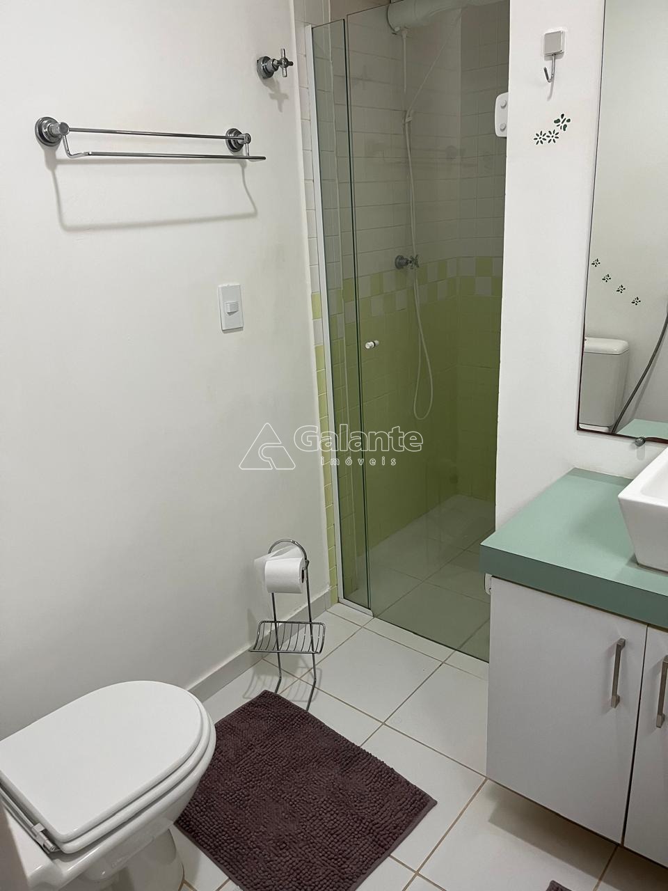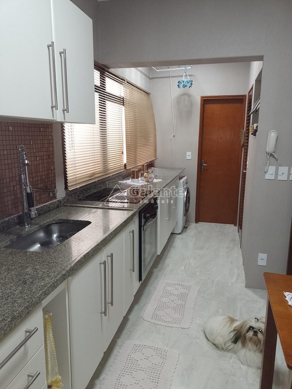 Cozinha planejada, área de serviço com banheiro de empregada, banheiro social com blindex e gabinetes.