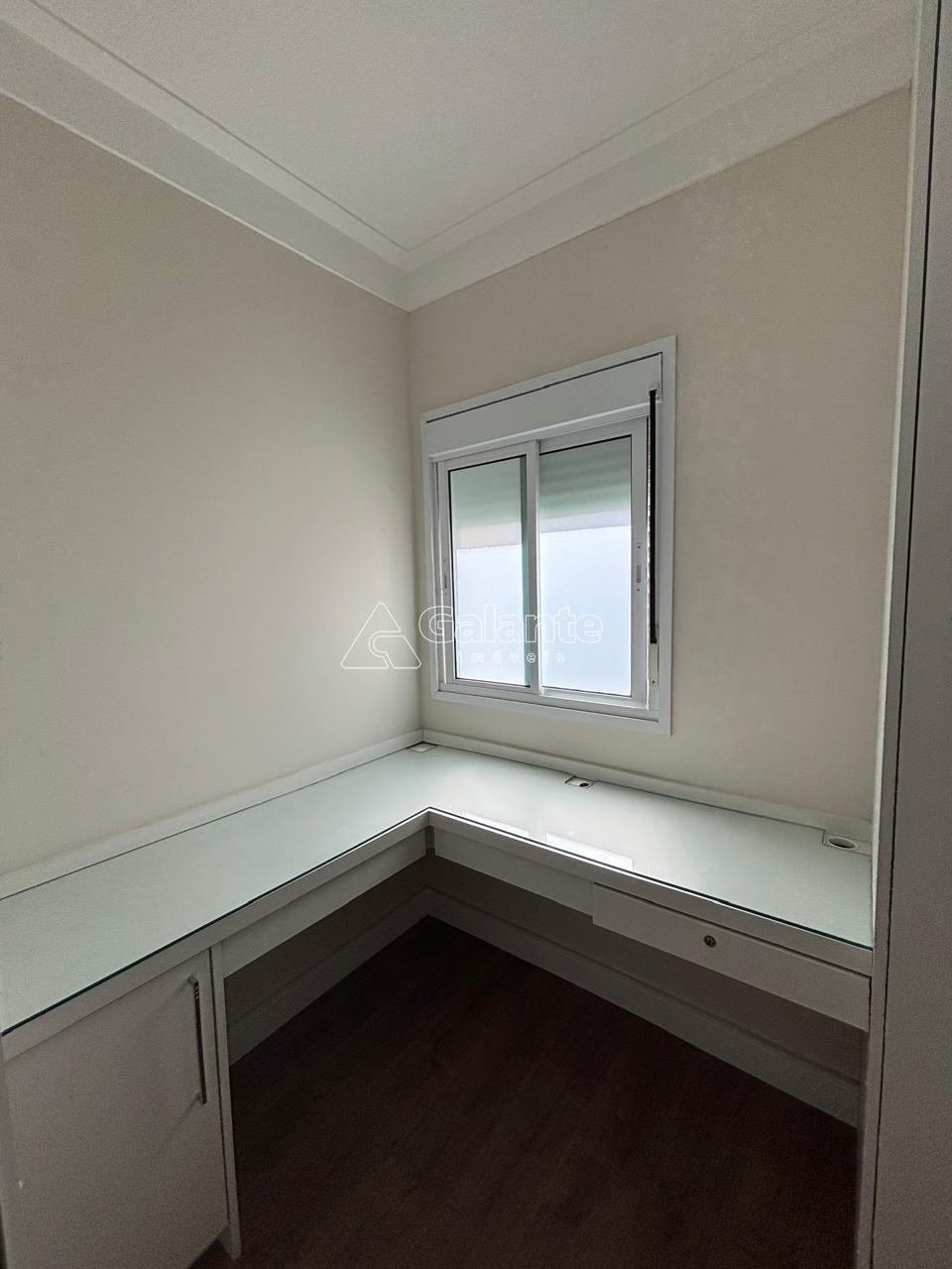 A ampla suíte dispõe de closet espaçoso integrado a um ambiente de home office, ideal para quem busca funcionalidade e organização.