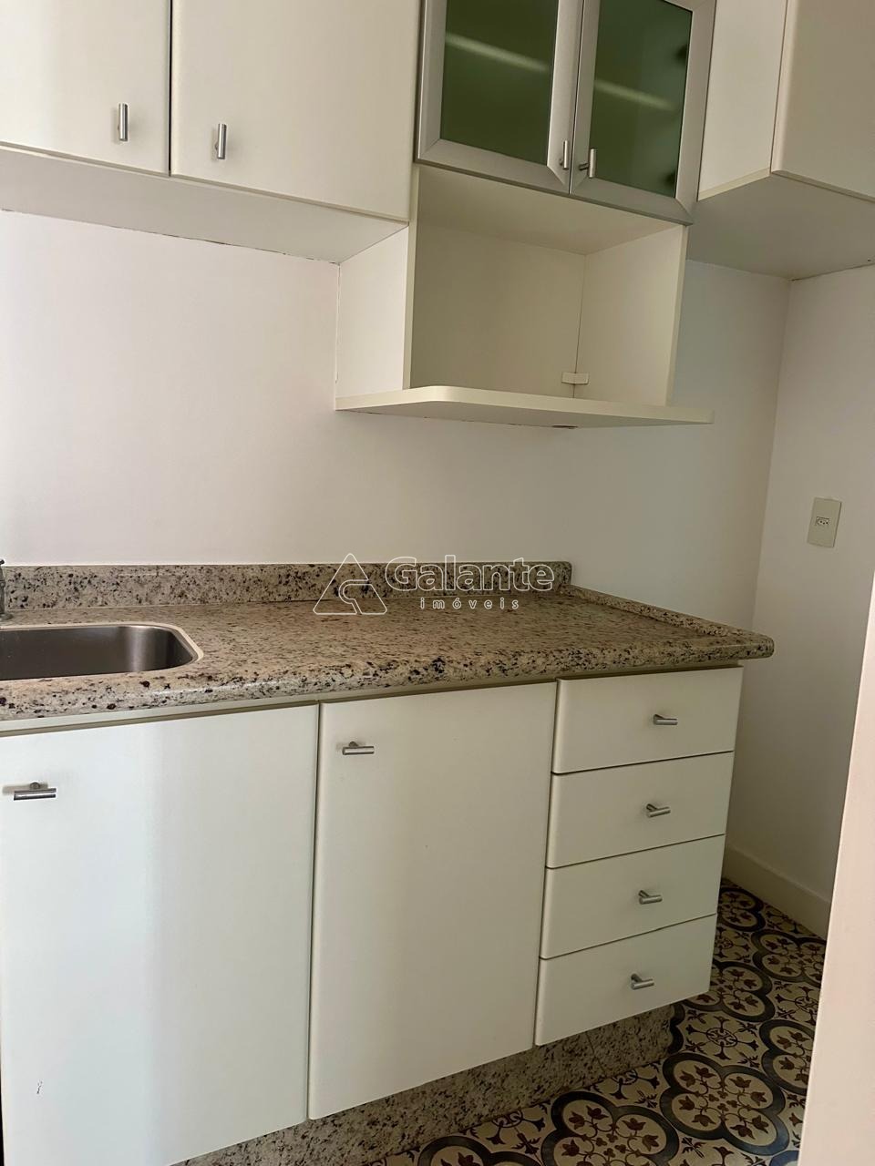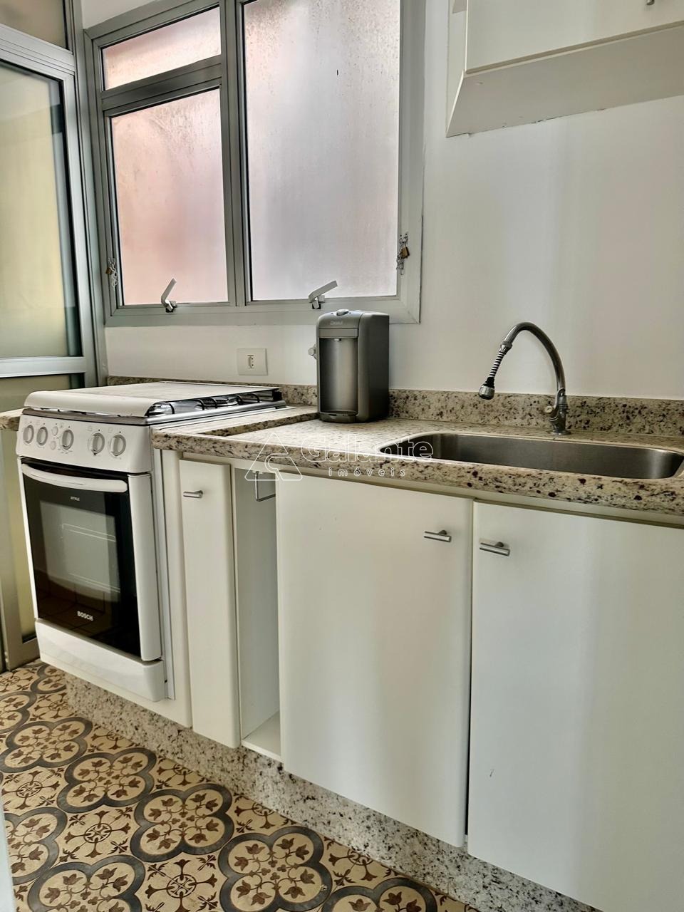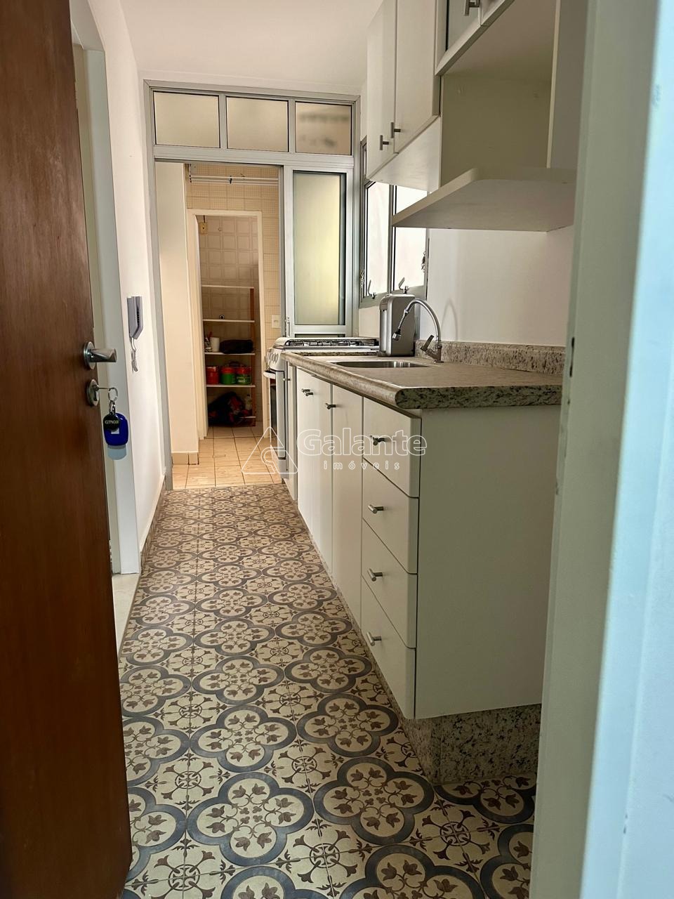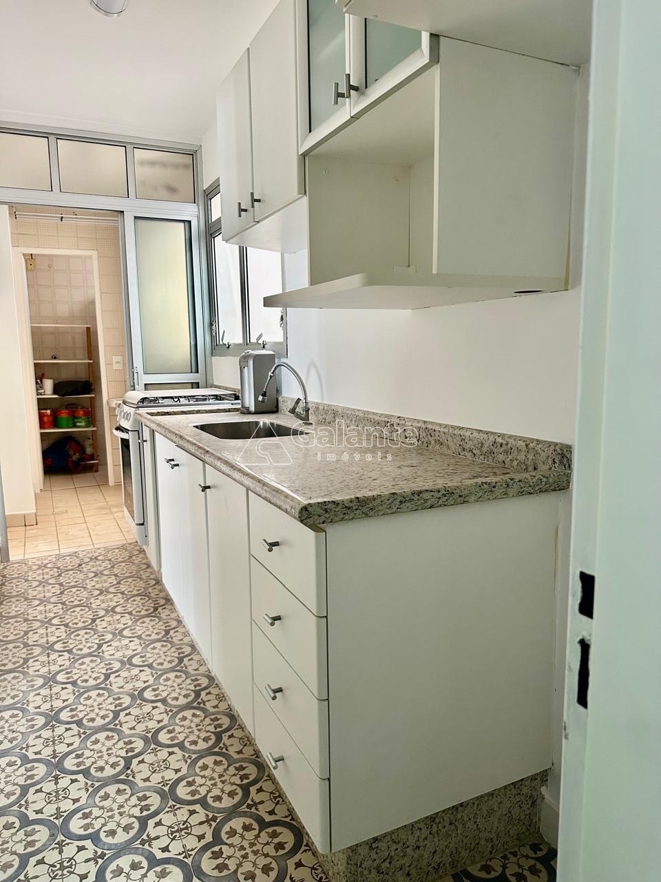 Cozinha com piso hidráulico e marcenaria.